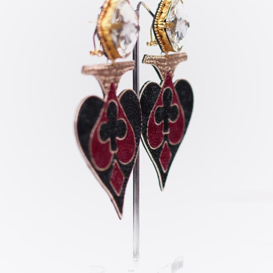 Estos pendientes, con sus palos de cartas (diamante, corazón, pica y trébol) intrincadamente encajados, están rematados con una brillante piedra de cristal. Son perfectos para quienes aprecian los diseños intrincados con un toque de brillo.